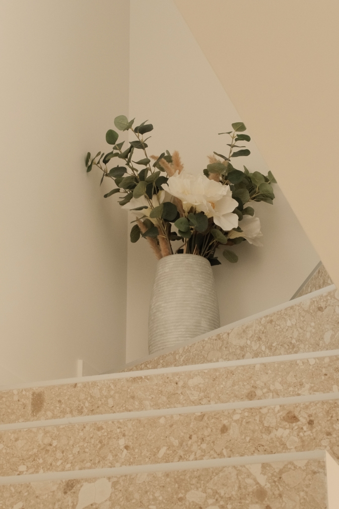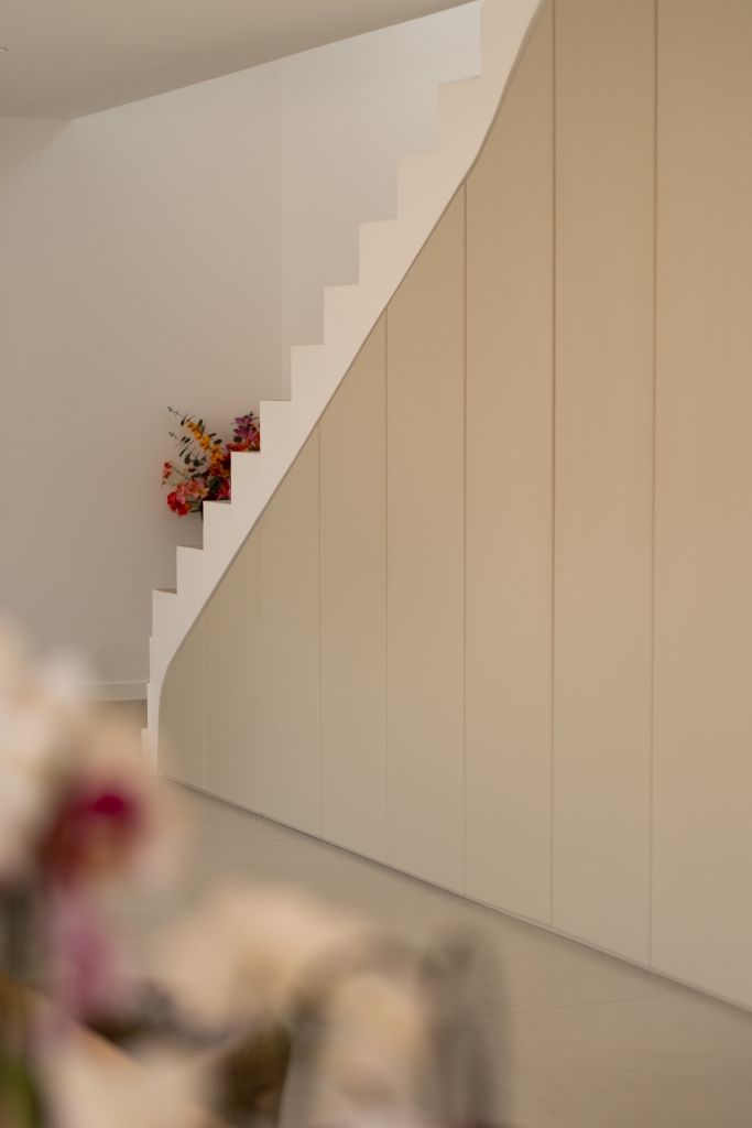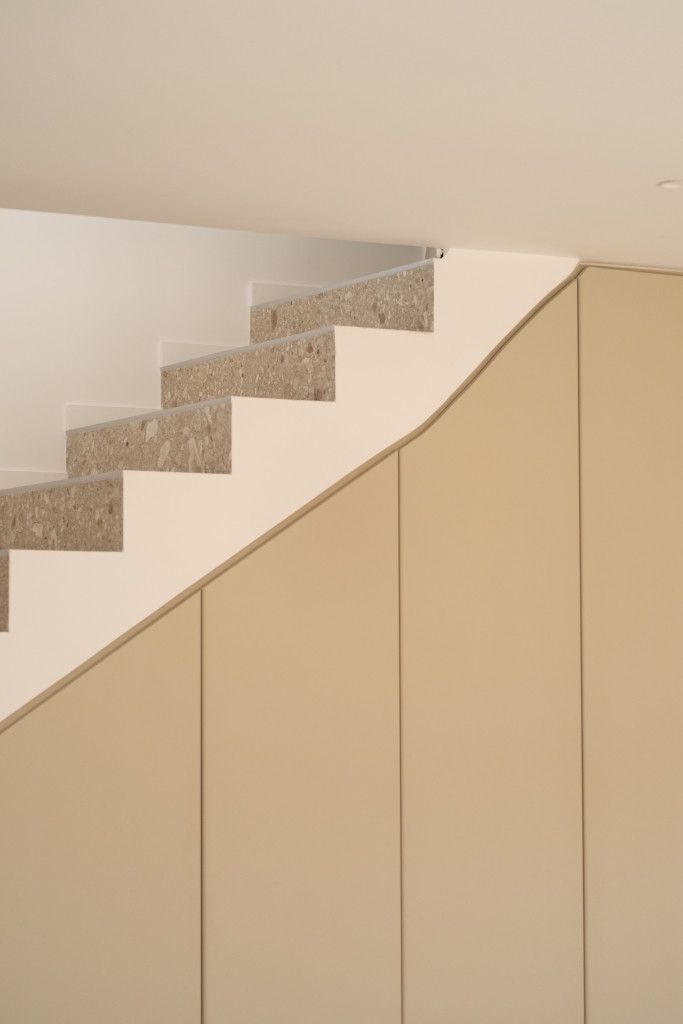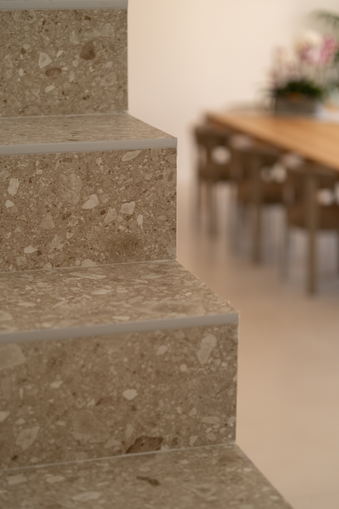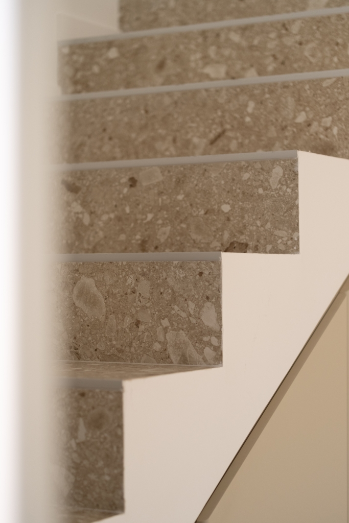 Pour les escaliers, le choix s’est porté sur la collection Realstone Ceppo Beige en 60×120. Inspiré de la pierre Ceppo di Gré, ce revêtement se distingue par son caractère minéral et ses inclusions graphiques qui apportent du relief et de la personnalité.