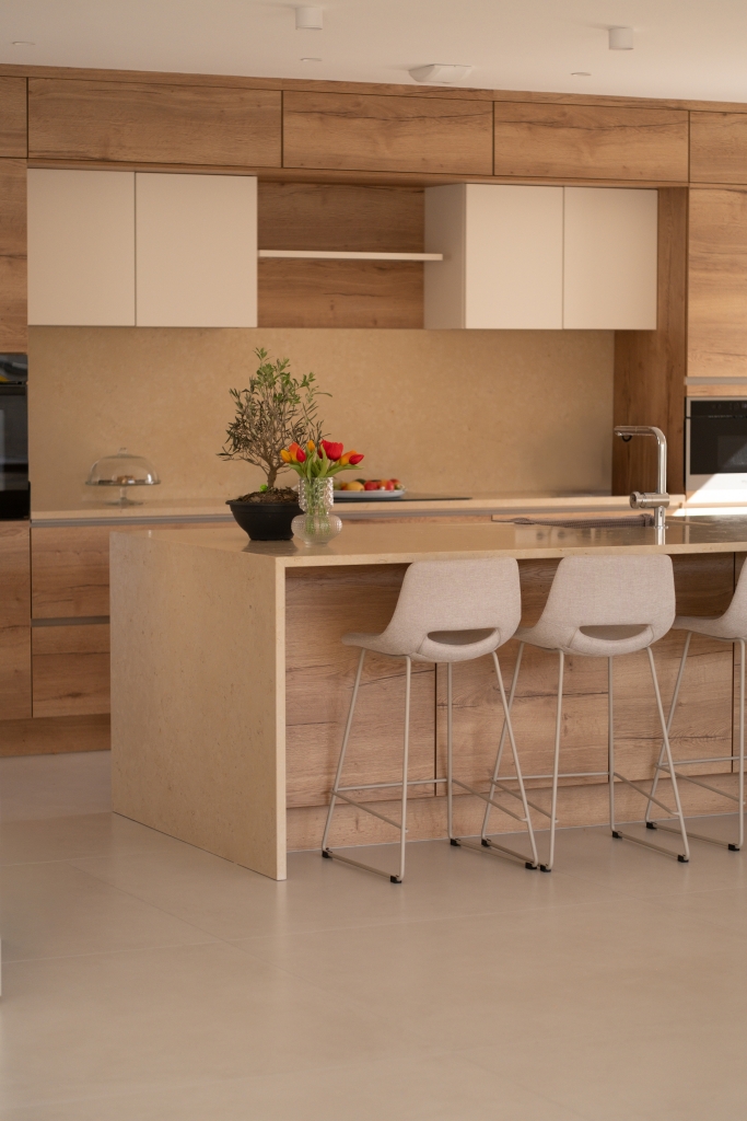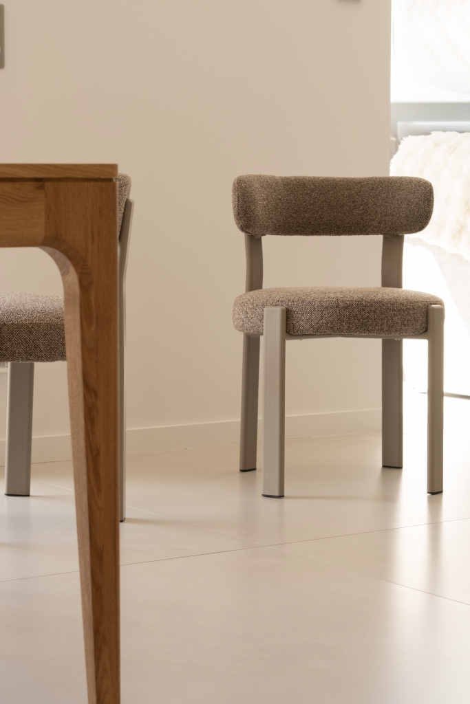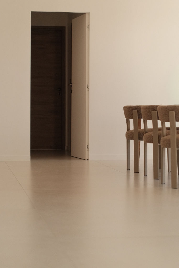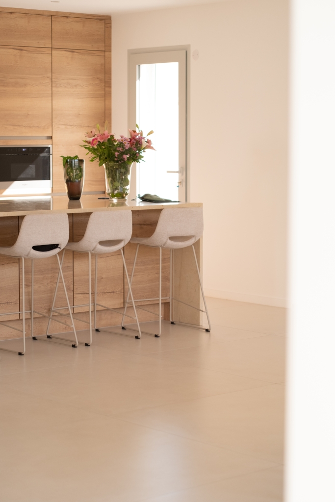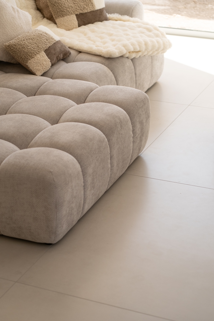 L’ensemble du sol a été habillé avec le grès cérame Capitol Blanco en 120×120. Ce grand format apporte immédiatement une sensation d’espace et de fluidité, en réduisant les joints au minimum. Sa teinte blanche subtilement nuancée capte la lumière naturelle et la diffuse dans toutes les pièces, offrant une base lumineuse et intemporelle à l’ensemble de l’habitation.