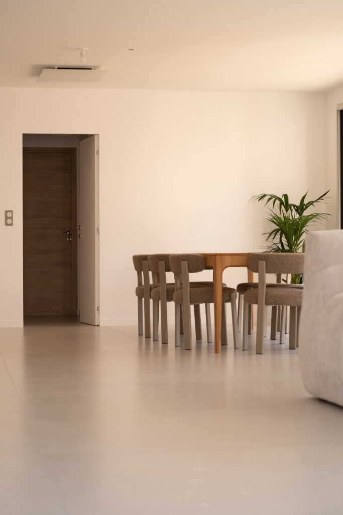 Dans cette maison, le choix des revêtements a été pensé pour créer une atmosphère à la fois contemporaine, élégante et chaleureuse.