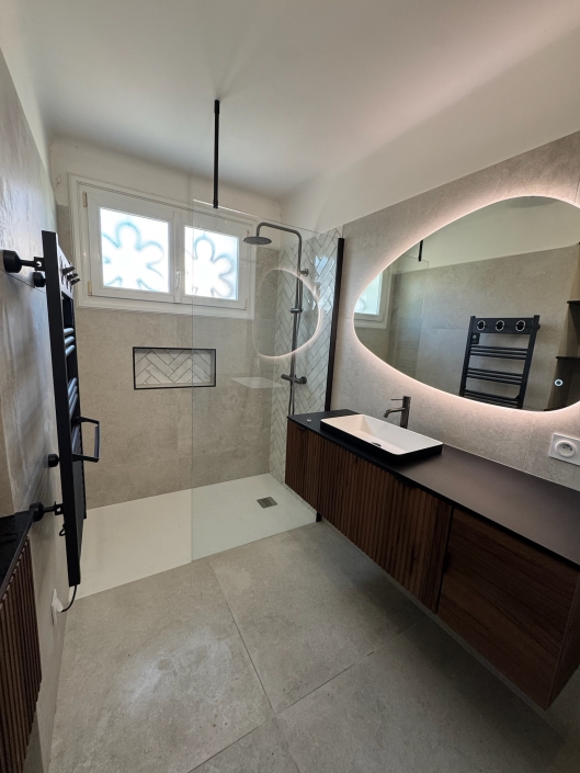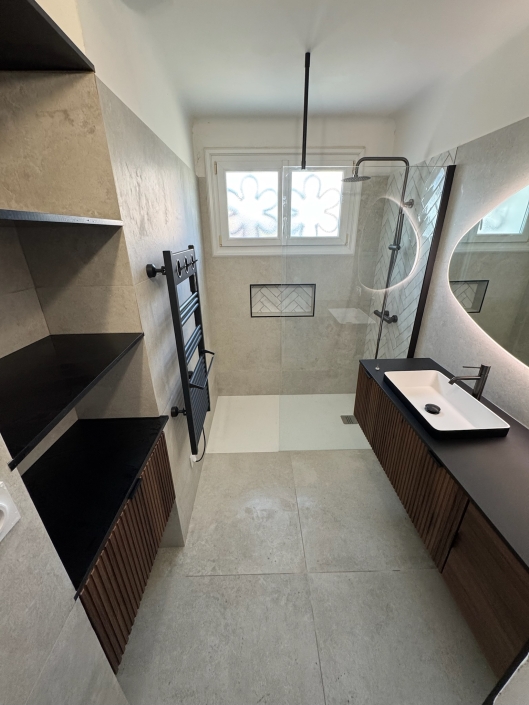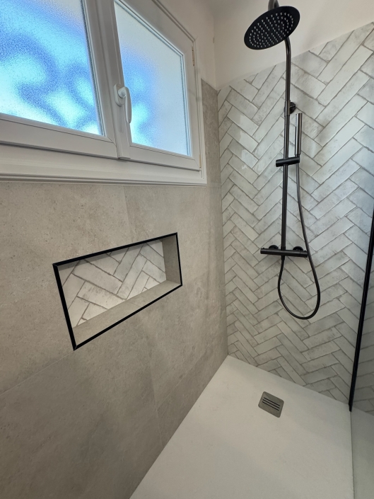 Le carrelage de la gamme St Remy habille le sol et les murs, offrant une toile de fond sophistiquée avec ses nuances douces